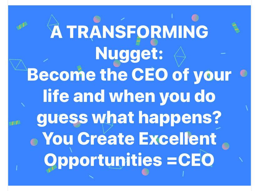 ATransforming Nugget – Become the CEO Posted byDr. TracyAugust 22, 2020Posted inMotivation, Purpose, TransformationTags:CEO, Create, Excellent, Motivation, Transform Share this: Click to share on X (Opens in new window) X Click to share on Facebook (Opens in new window) Facebook Like Loading... Related